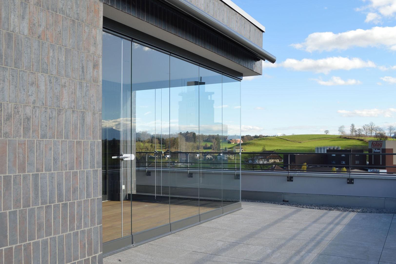 Der erste Glasflügel kann per Griff geöffnet oder nur in Belüftungsposition gebracht werden, wobei das optionale Riegelschloss im Griff mit einem Schlüssel festgestellt wird. Wenn der erste Drehflügel geöffnet ist, werden alle Glasflügel nacheinander in die Anschlussposition geschoben, 90° aufgedreht, ineinander verriegelt und so geparkt. Die Verglasung lässt sich auf diese Weise teilweise oder vollständig öffnen. Eine Fixierung sichert das seitliche Flügelpaket. Die Schiebeflügel können bei mehrseitigen Verglasungen übers Eck gefahren werden.