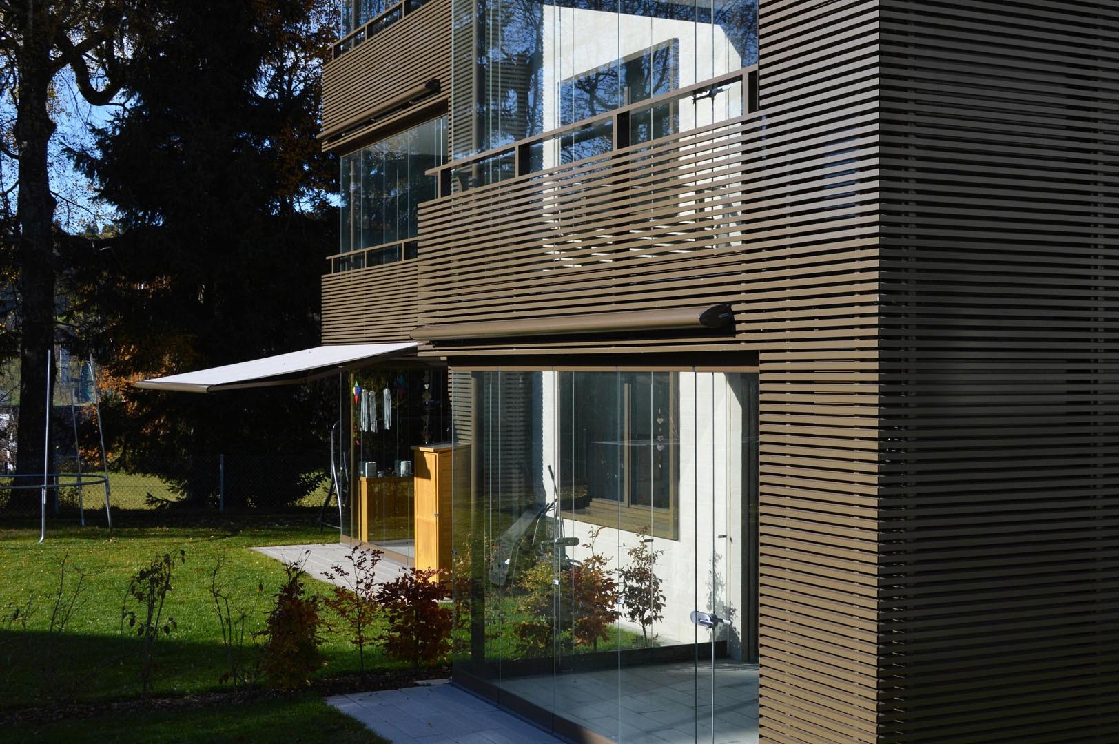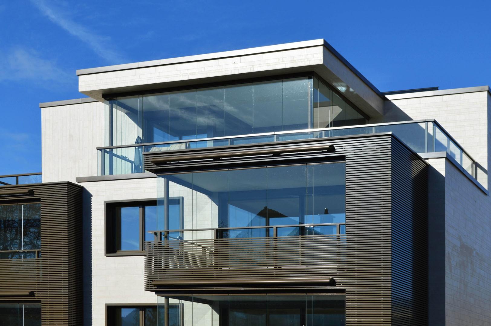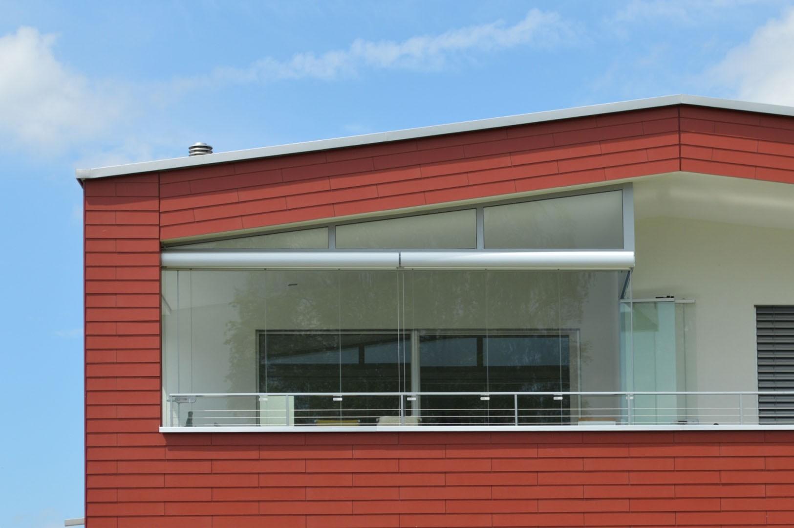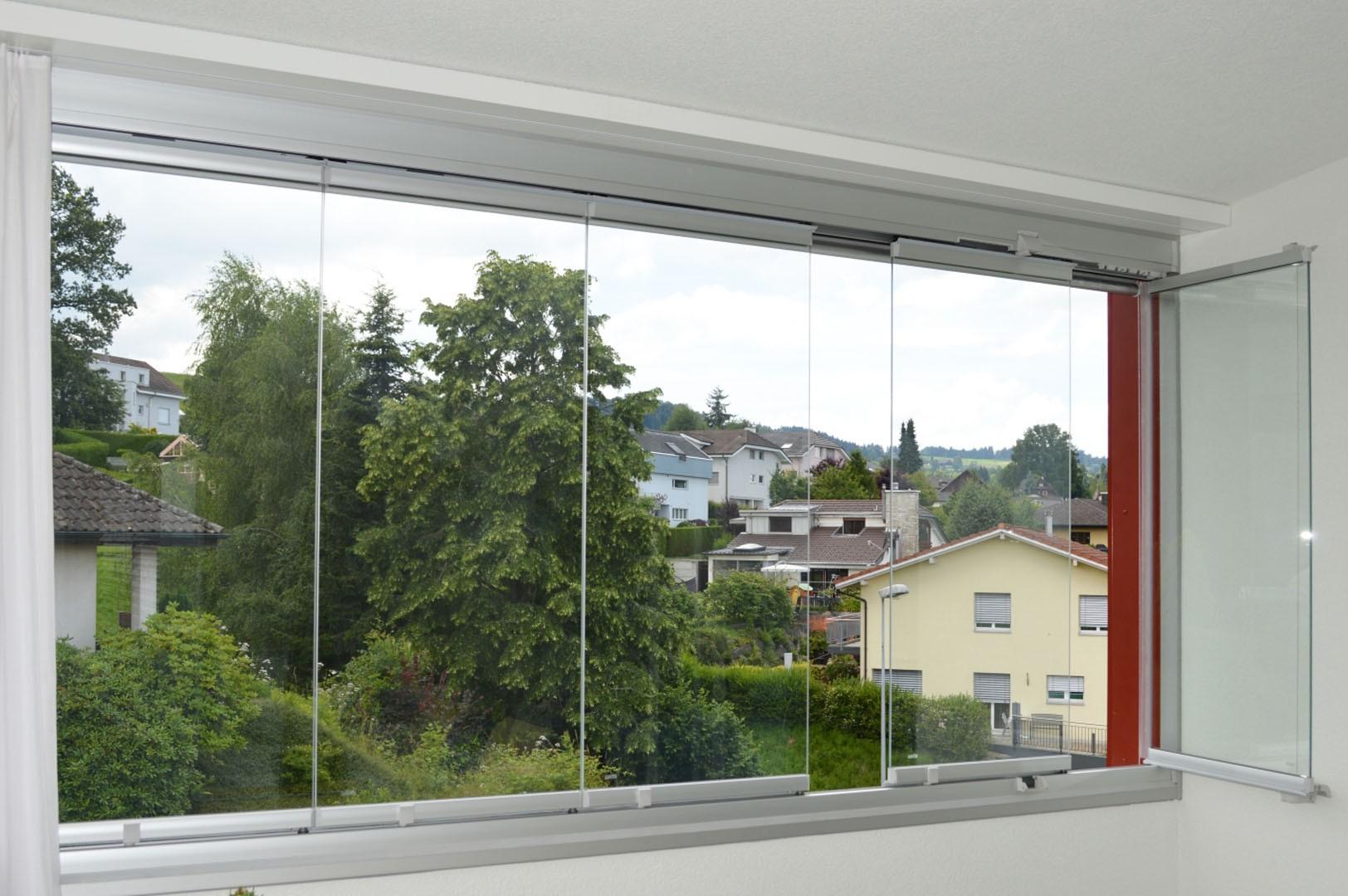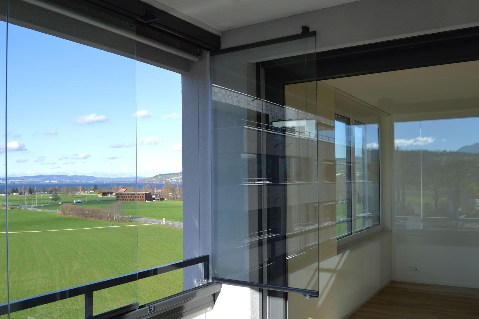 Flexible Wandanschlussdichtungen nehmen selbst grössere Unebenheiten der Wand auf. Die 2-3 mm breiten, vertikalen Spalten zwischen den Glasflügeln belüften den Balkon auf natürliche Weise, so dass Balkon und Konstruktion trocknen können und die Scheiben nicht feucht anlaufen.