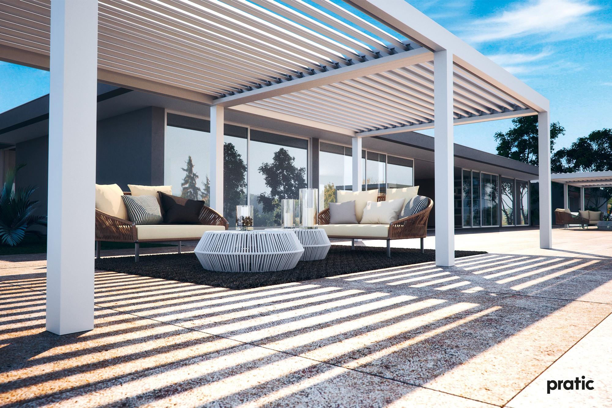 Die Aluminiumpergola verfügt über motorisierte, 0–140° einstellbare Lamellen und ist in freistehender oder wandmontierter Ausführung erhältlich. Integrierte Wasserabläufe und motorisierte Bedienung sorgen für zusätzlichen Komfort.