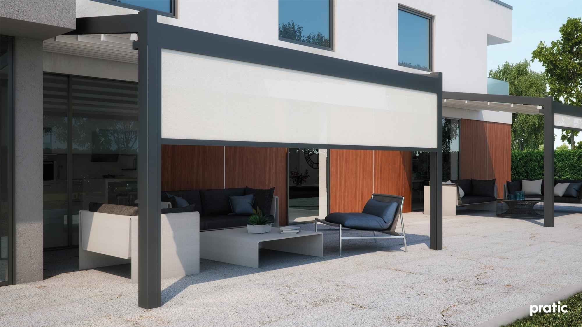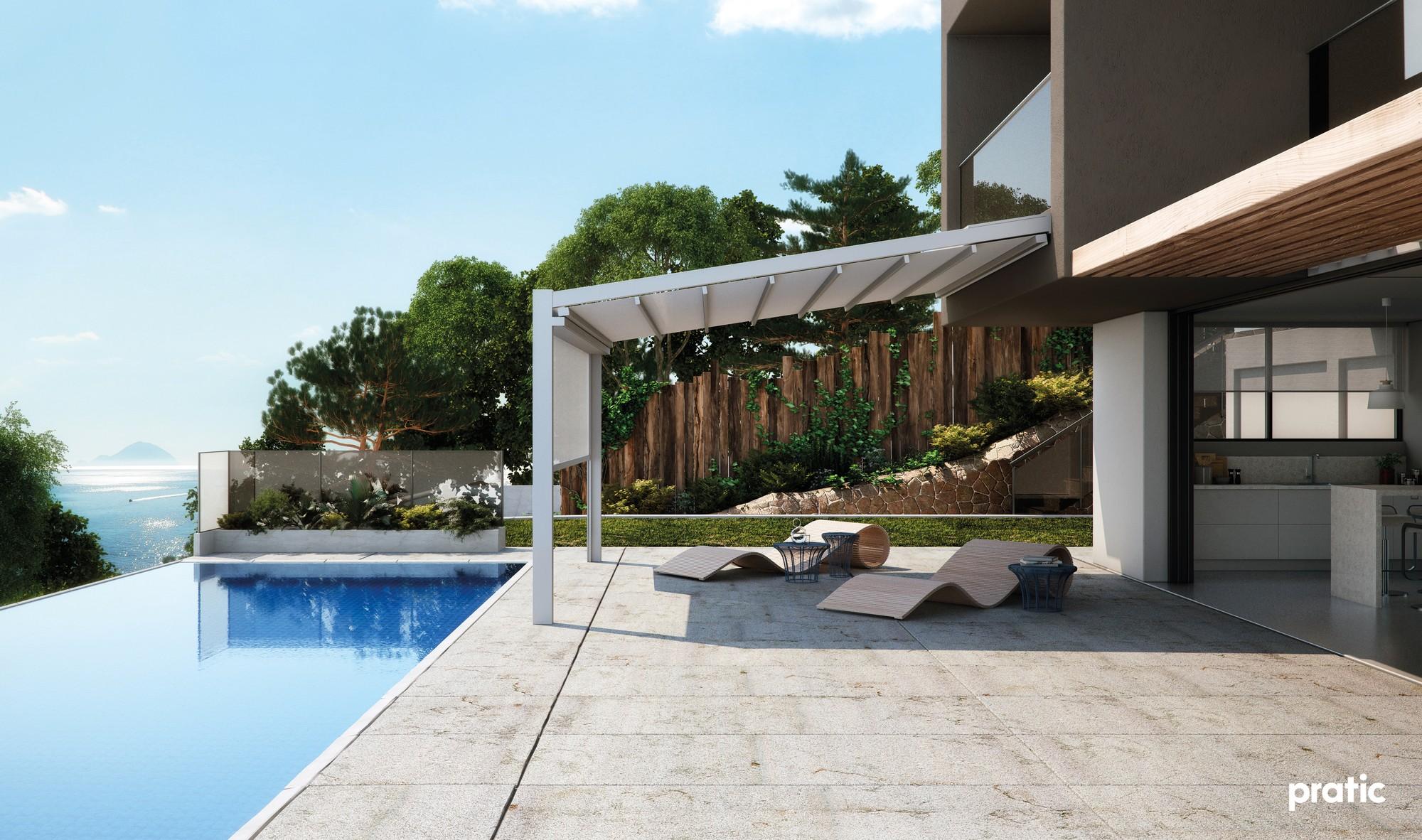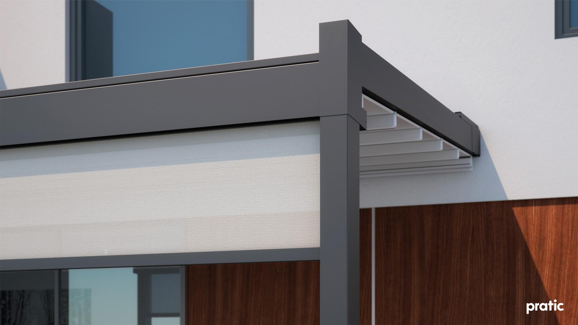 Die wandmontierten Pergolen Fusion und Meta überzeugen durch ihre flexible Konstruktion mit verschiebbarem PVC-Dach. Einzelne Module lassen sich zu grosszügigen Anlagen mit bis zu drei Modulen kombinieren. Die Pergolen sind in verschiedenen Konfigurationen realisierbar, können nebeneinander installiert werden und lassen sich sowohl manuell als auch motorisiert bedienen. Ein integrierter Wasserablauf mit Rinne sorgt für zuverlässigen Schutz bei Regen.