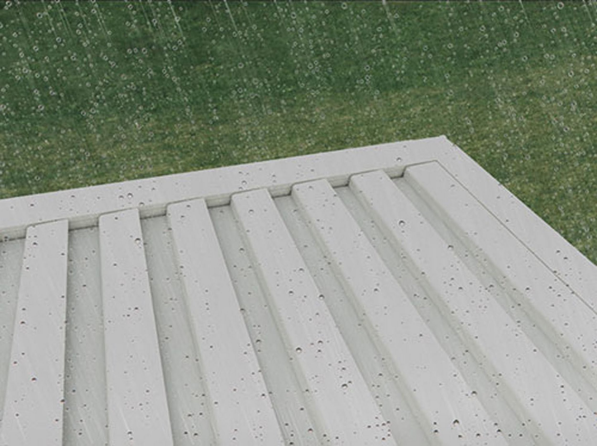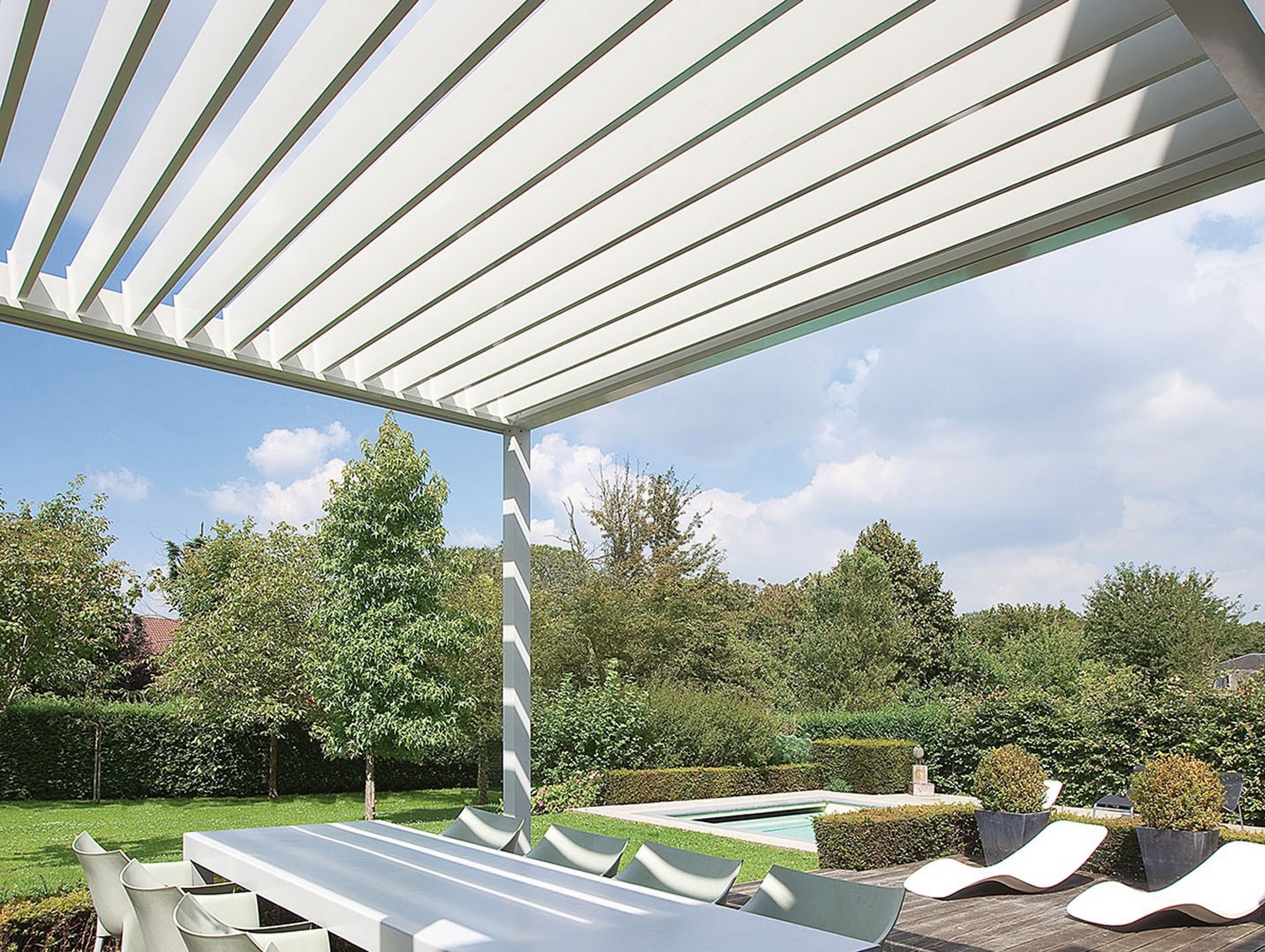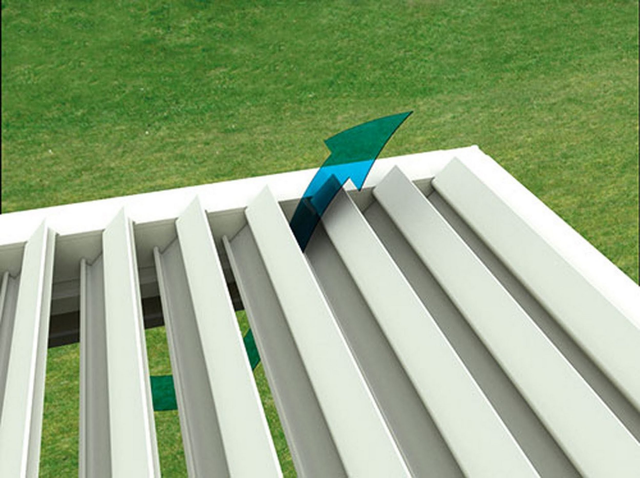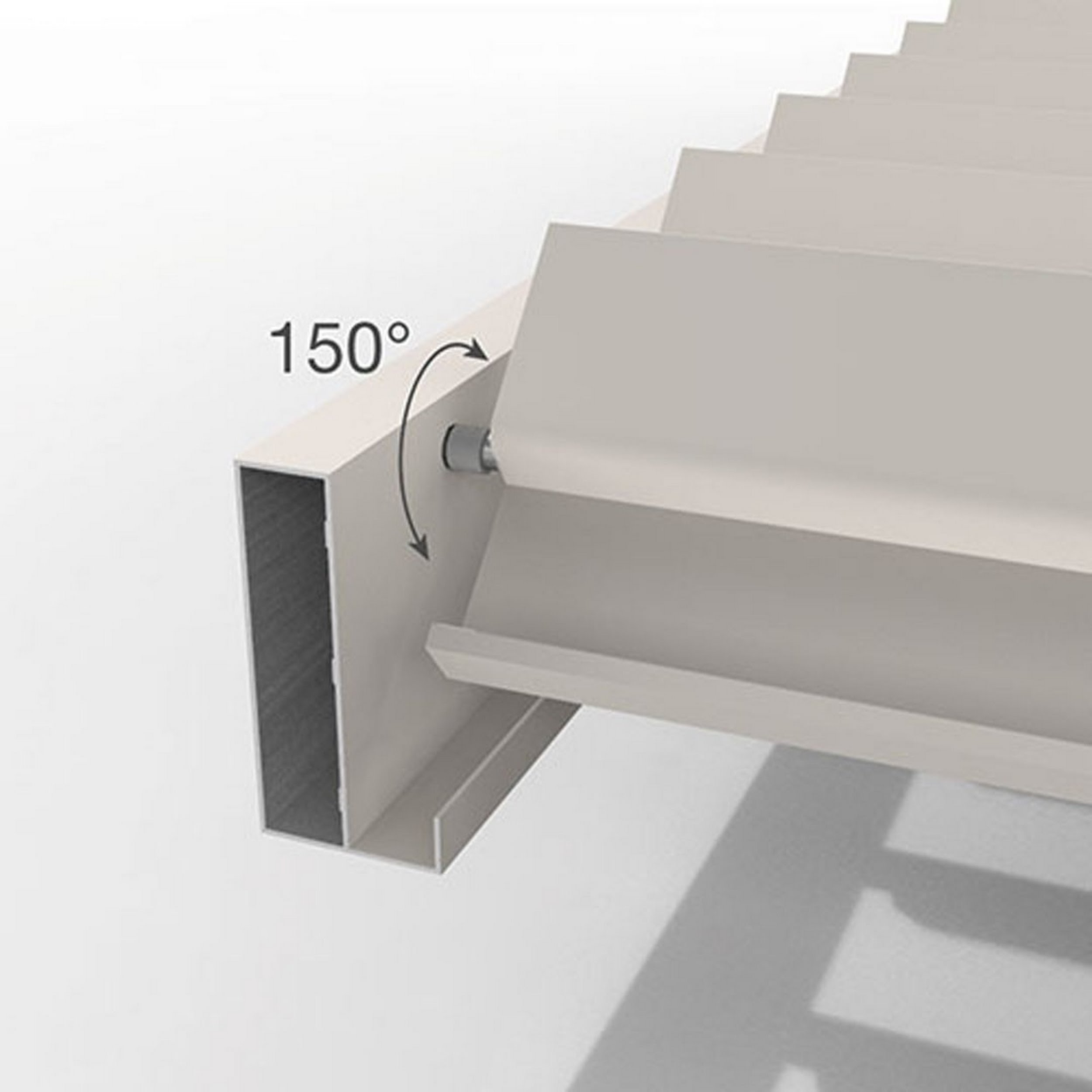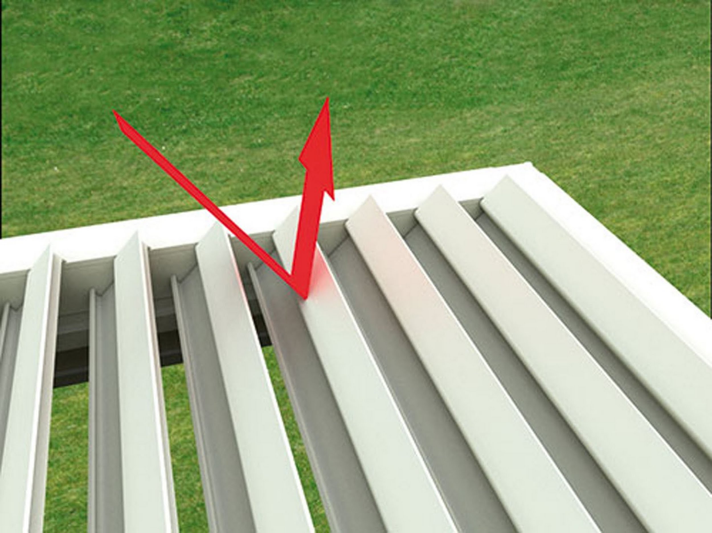 Das System Algarve ist mit einem horizontalen, wasserabweisenden Sonnenschutzdach aus verstellbaren Aluminiumlamellen ausgestattet. Dank der geräuscharmen Verstellfunktion der Lamellen können Sie den idealen Lichteinfall und die gewünschte Lüftung individuell selber bestimmen. Wenn Sie die Lamellen bei Regen schließen, ist ein guter Regenschutz gewährleistet. Die patentierten Lamellen sind so konzipiert, dass das Regenwasser nach einem Schauer beim Öffnen der Lamellen zur Seite abfließt, so dass das Wasser nicht in den Raum abtropft.